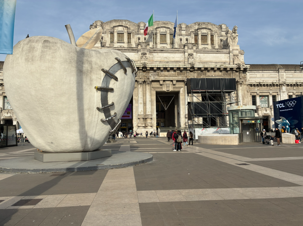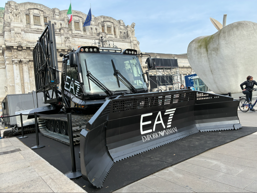 ミラノは気温が14℃と暖かく気持ちいいのでコーヒーを買ってミラノ駅前の花壇に腰掛けてのんびりする事に、駅前にアルマーニの雪上車(除雪・ゲレンデ整備用)EA7が展示されてたので撮影。何百人、何千人と前を通って行きますが、5人に1人くらいの割合でみんな写真を撮っていきます。あと、多くの若者がスケボーやサッカーボールで遊んでるので見てて飽きない。