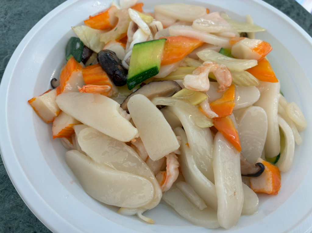 海鮮炒年糕(かいせんチャオニエンガオ)。薄切りのもち米餅を炒めた料理。もっちもちのホクホク。