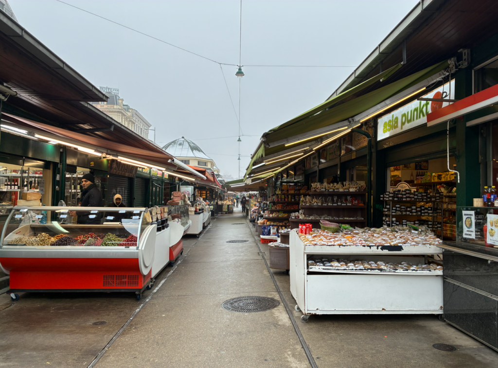 ウィーンでいちばん有名な屋外マーケット、ナッシュマルクト(Naschmarkt)。全長約1.5kmの細長い市場で新鮮な野菜・果物、チーズ、ハム、スパイス、ナッツ、パンがずらり。隣の通りは、レストラン通りでオーストリア料理だけでなく中東・トルコ・バルカン・アジア系まで超多国籍なお店がズラリ。