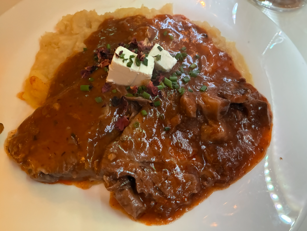 メイン料理はリービッツ(Ribic)。ウィーンの家庭料理っぽい説明がありましたが、とろとろの牛スネ肉のビーフシチュー&マッシュポテトって感じでした。とろとろで美味い。