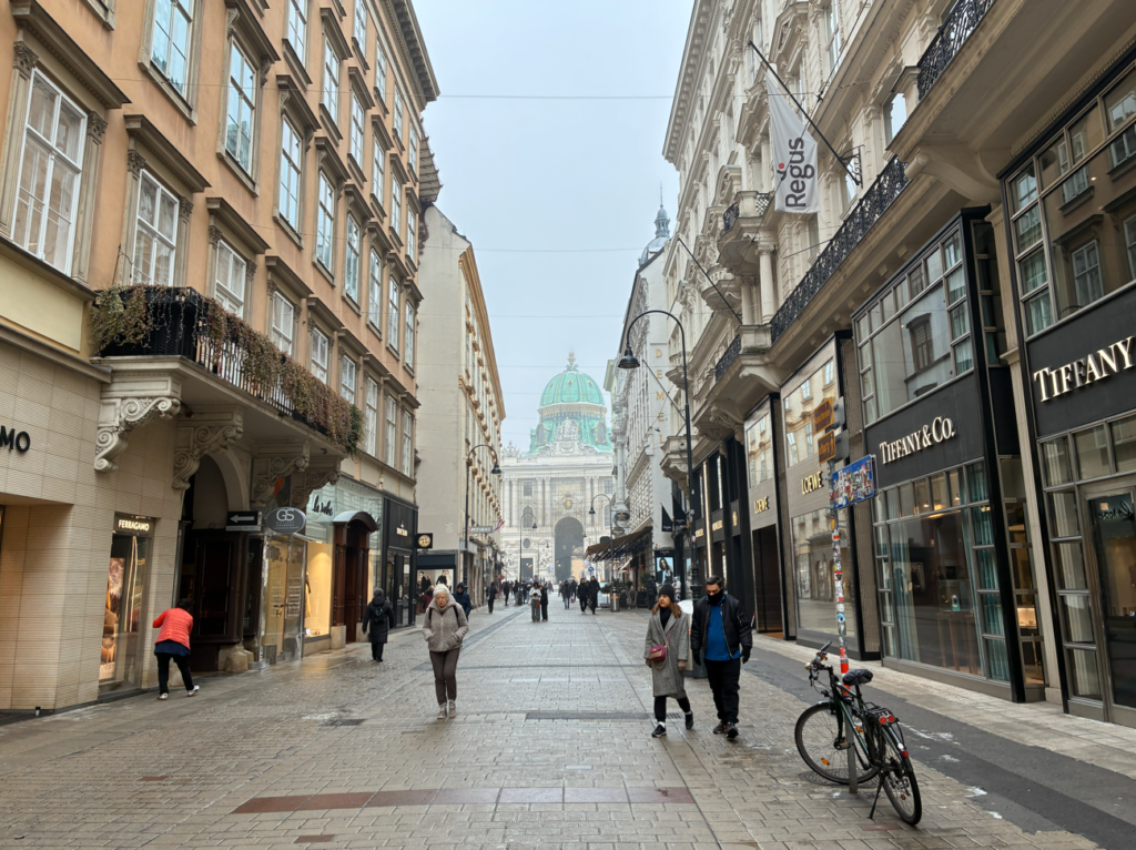 ウィーン旧市街を代表する高級ショッピングストリートのコールマルクト(Kohlmarkt)。Cartier / Louis Vuitton / Tiffany & Co. / Rolex などが並んでます。私の格好だと入るのも躊躇われる高級店たちですね(笑)。